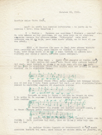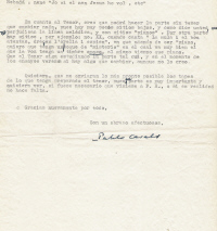 Rebadá : nene "Jo si el nen Jesus ho vol, etc" En cuanto al Tenor, creo que podrá hacer la parte sin tener que cambiar nada, pues hay muy pocos sitios bajos, y como dice usted no perjudican la línea melódica, y son sitios "pianos". POr otra parte hay sitios, por ejemplo: no. XX, cuando canta: "La mula i el bou atentas, dreçen l'orella i espien", en que además de ser "piano, quiero que tenga un toque de "misterio" en el cual va muy bien el que la voz tenga un timbre opaco, al mismo tiempo que piano. Quisiera, que me enviaran los más pronto posible los tapes de lo que tenga preparado el tenor, pues esa parte es muy importante y quisiera ver, si fuese necesario que viniese a P. R., o si en realidad no hace falta. Gracias nuevamente por todo, Pablo Casals |