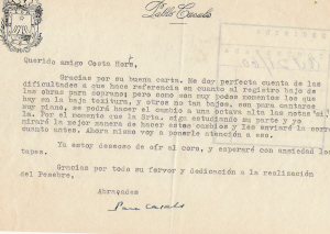 Querido amigo Costa Horts, Gracias por su buena carta. Me doy perfecta cuenta de las dificultades a que hace referencia en cuanto al registro bajo de las obras para soprano; pero como son muy pocos momentos los que hay en la baja texitura, y otros no tan bajos, son para cantarse muy piano, se podrá hacer el cambio a una octava alta las notas "si", y la. Por el momento que la Srta. siga estudiando su parte y yo miraré la mejor manera de hacer estos cambios y les enviaré la corrección cuanto antes. Ahora mismo voy a ponerle atención a eso. Ya estoy deseoso de oír al coro, y esperaré con ansiedad los tapes. Gracias por todo su fervor y dedicación a la realización del Pesebre. Abraçades Pau Casals Revers: Recibida: / Contestada: Oct 21/60 |