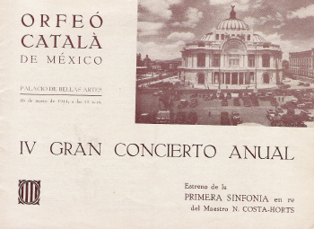 ORFEÓ CATALÀ DE MÉXICO IV GRAN CONCIERTO ANUAL Estreno de la PRIMERA SINFONIA en re del Maestro N. Costa-Horts Breve historial del "Orfeó Català" de México [...] Segunda época En 1940, con la llegada a México de nuevos contingentes catalanes y entre ellos un músico joven, inteligente y entusiasta -Narcís Costa-Horts- pudo cerrarse aquel paréntesis de trece años y sobre el recuerdo glorioso de susm predecesores, la masa coral del Orfeó resurgió, ampliada y modernizada, con un mayor número de integrantes y con la incorporación de voces femeninas. Este nuevo conjunto -diríamos mejor el nuevo Orfeó- debutó el día 3 de marzo de 1940 en el local social de los catalanes de México, la vieja y tradicional llar de la colonia catalana. Fué aquella presentación un acontecimiento inolvidable. Unos meses después -el 5 de enero de 1941- presentóse el Orfeó ante el público mexicano en el Anfiteatro Bolívar. El éxito fué clamoroso y aquella actuación quedó registrada como el I Gran Concierto del Orfeó Català en su nueva etapa A partir de entonces, el Orfeó Català ha participado en infinidad de actos organizados por la colonia catalana o por entidades mexicanas. Ningún acontecimiento de importancia para los catalanes de México ha podido prescindir de la colaboración del Orfeó Català, que se ha visto constantemente solicitado. [...] |