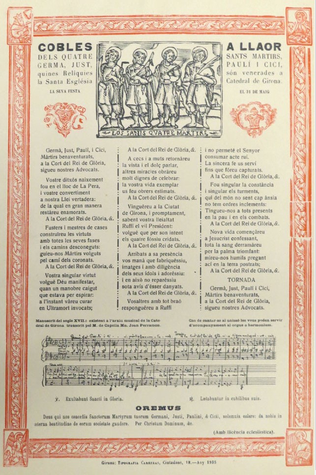 (Ampliar) - Cobles a llaor dels Quatre Sants Martirs. Peu d'impremta: Tpografia Carreras. Ciutadans 18. 1935.