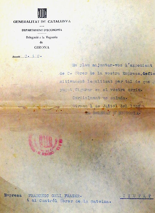 (Ampliar) - Expedient de legalització de l'establiment emès per la Generalitat l'1 de juliol de 1938.