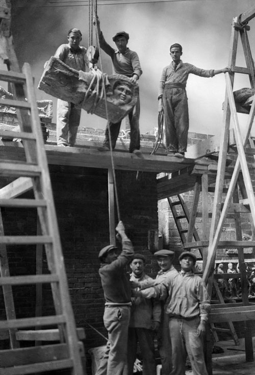 (Ampliar) - Trasllat de les peces dels museus cap Olot. 1937. Generalitat de Catalunya La guerra del Patrimoni. La destrucció del patrimoni es caonvertir durant la guerra en un camp de propaganda i de contra-propaganda. El franquisme pretenia internacionalitzar el descrèdit de la barbàrie salvatge, mentre que la Generalitat tractava, per tots els mitjans, d'oposar a aquesta visió una imatge de civilització organitzada, que sense negar l'evidència dels fets, en minimitzés l'impacte. Així, el Comissariat de Propaganda de la Generalitat, dirigit per Jaume Miravitlles, no va parar de promoure accions reparadores i de reivindicació, com ho mostren diverses publicacions vinculades, poc o molt, a la gran exposició d'art català presentada el 1937, en el Musée du Jeu de Paume de París.