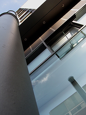 Detall de la façana de l'escola Joan Bruguera al carrer dels Artillers