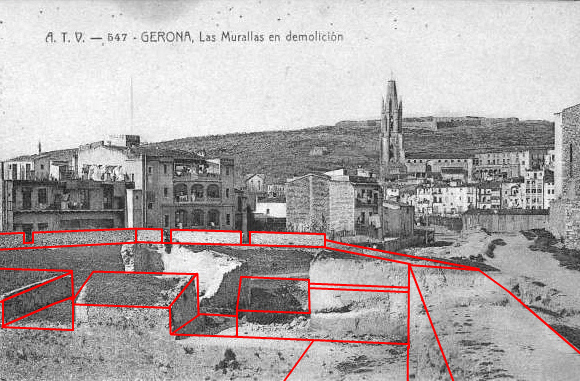 El baluard de la Santa Creu, poc abans del seu enderroc, 1901-1902. Fotografia: Ajuntament de Girona CRDI. Reconstrucció: Museu d'Història de la Ciutat