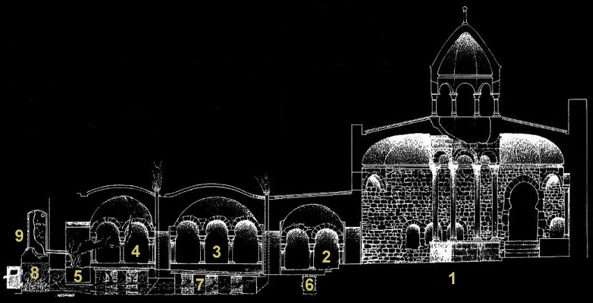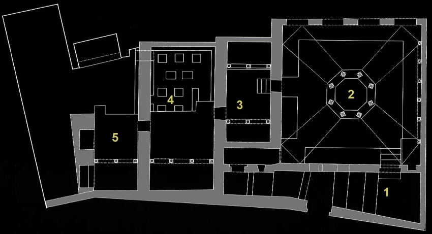 Planta dels Banys Àrabs de Girona, amb indicació de les modificacions realitzades per les monges en el temps en què els banys varen estar integrals dins el convent de les caputxines (1618-1929). El vestibul va ser convertit en el forn de coure pa (1), els antics vestuaris en el safareig (2), la sala freda en rebost (3), la sala tèbia en cuina (4) i la sala calenta (5) va ser parcialment enderrocada i en el seu lloc s'hi bastiren algunes dependències conventuals. (Dibuix basat en "La Girona del s. xIII", J. Canal, E. Canal, J.M. Nolla i J. Sagrera).