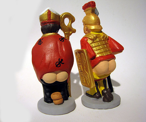 ![]() Figura obligada en els pessebres vuitcentistes, es considerava que amb la seva deposició femava la terra del pessebre per a l’any següent i amb ell la salut i la tranquil·litat de cos i d’ànima, característiques de reminiscències ben reculades en el temps. Fer figurar aquest homenet en el pessebre portava sort i alegria a la llar, i no fer-ho comportava desventura. El caganer és una figura dels pessebres de Catalunya, sovint amagada en un racó, darrere d'un arbust, on fa les seves necessitats a l'aire lliure. Vestit, generalment, amb camisa blanca, pantalons foscos, faixa i barretina vermelles, sovint amb pipa. L'home que caga, l'home que fa les seves necessitats són altres noms que se li han atribuit. L'origen del caganer sembla ser que se situa entre el canvi dels segles XVII i XVIII, en ple Barroc, un moviment cultural i artístic que es caracteritzava per un realisme exagerat. Per llavors no era només en el Pessebre sinó que s'ha trobat en rajoles que el representen explicant històries. Els caganers apareixen ja als pessebres catalans a finals del segle XVII, encara que no es van fer populars del tot fins al XIX i principis del XX. ![]() (Ampliar) - Caganers Sant Narcís i Manaia.El caganer no és l'únic personatge nadalenc típic dels Països Catalans que defeca. Existeix una altra antiga tradició, el Tió, un tronc d'arbre que els nens escullen i que és portat al menjador de la sala. És cobert per una manta perquè no passi fred i és alimentat fins el dia de Nadal, on els nens i nenes de la casa, tot cantant-li típiques cançons de Catalunya, li donen cops amb un bastó perquè "cagui" neules, torrons, dolços i llaminadures. Actualment, la producció artesana dirigida a col·leccionistes d'aquest element pessebrista fa que representi personatges molt variats com ara polítics, guàrdies civils o mossos d'esquadra, els reis mags, el pare noel, monges i capellans, pastors, jugadors del Barça o l'Espanyol, bruixes, el negre de Banyoles, executius, legionaris romans o bombers sense deixar d'estar en la seva posició característica. El pagès no ha deixat, però de ser la forma més popular i tradicional. A més de caganers, i amb la mateixa línia escatològica, darrerament també apareixen "pixaners" en els pessebres. Les característiques especials d'aquest personatge fan que sigui objecte de col·lecció, al marge de la seva component de membre dels tradicionals pessebres, i així han sorgit associacions d'estudiosos i col·leccionistes de caganers. ![]() (Ampliar) - Caganers Sant Narcís i Manaia. |