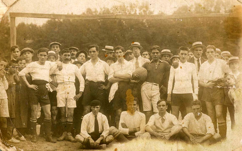 (Ampliar) - Retrat de grup d'una formació local davant d'una porteria del Camp de Mart de la Devesa a Girona. S'identifica a Parés, Jaume Pons, Tata, Padrosa i Xifra. 1903. Autor desconegut. CRDI - Ajuntament de Girona Josep Pla, al seu llibre "Girona, un llibre de records", en deia "Seguint la gran avinguda a la dreta, hi havia el Camp de Mart. En aquest gran espai — que es la part mes francesa de la Devesa, en el sentit que fou concebut notòriament per fer-hi revistes i espectacles militars—, hi passàrem tantes hores de la nostra adolescència en llibertat, que no ens podríem pas estar d'estimar-lo.