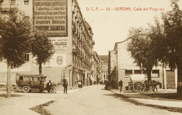 (Ampliar) - Vista del carrer Nou, a l'altura de la cruïlla amb la Gran Via de Jaume I. A l'esquerra, les cases del projecte Barnoya. A la dreta, un anunci de Adroher Germans pintat al mur. 1920. Autor desconegut. CRDI - Ajuntament de Girona.