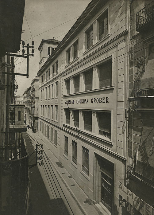 (Ampliar) - Façana de la fàbrica Grober al carrer Nou. A la dreta, Magatzems Llens. 1940. Carlos Pérez de Rozas. CRDI - Ajuntament de Girona.