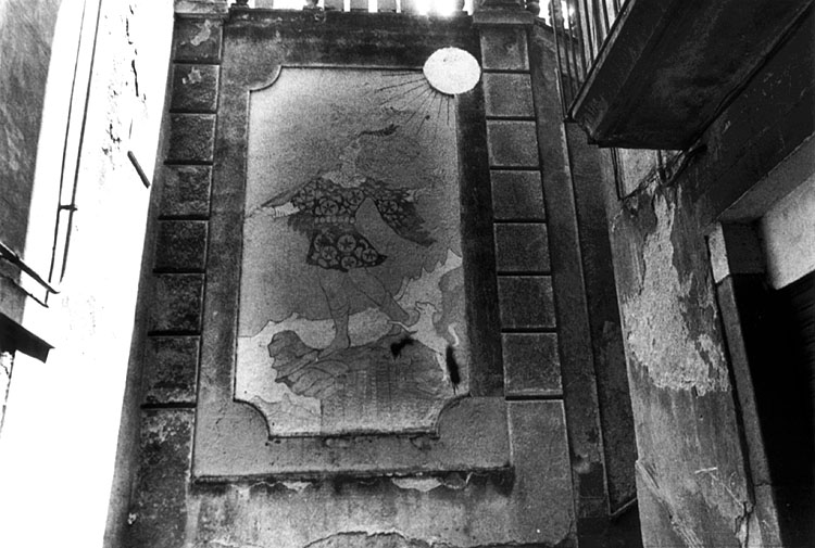 (Ampliar) - Mare de Déu de la Mercè, instal·lada en una fornícula a la cruïlla del carrer Nou del Teatre amb la plaça del Pallol abans de la restauració. 1984. Jordi S. Carrera. CRDI - Ajuntament de Girona.