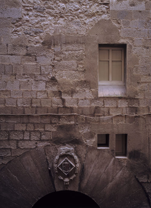 (Ampliar) - Porta adovellada que donava accés al Teatre Municipal des del carrer Nou del Teatre. A la dovella central es reprodueix l'escut de la ciutat de Girona. 2001. Jordi Puig. CRDI - Ajuntament de Girona.