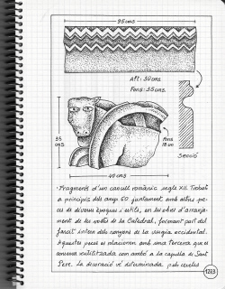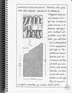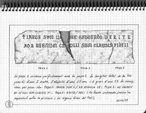 Apunts personals de l'exposició "Domus Domini". Fontana d'Or, juny 1997, en la que es varen exhibir els fragments esmentats. Dalt, esquerra: Fragment d'una cornisa romana | Dalt, dreta: Fragments de cancell romànic. Baix: Llinda amb inscripció d'una de les portes de la seu romànica. Dibuixos i notes del natural de Fèlix Xunclà.