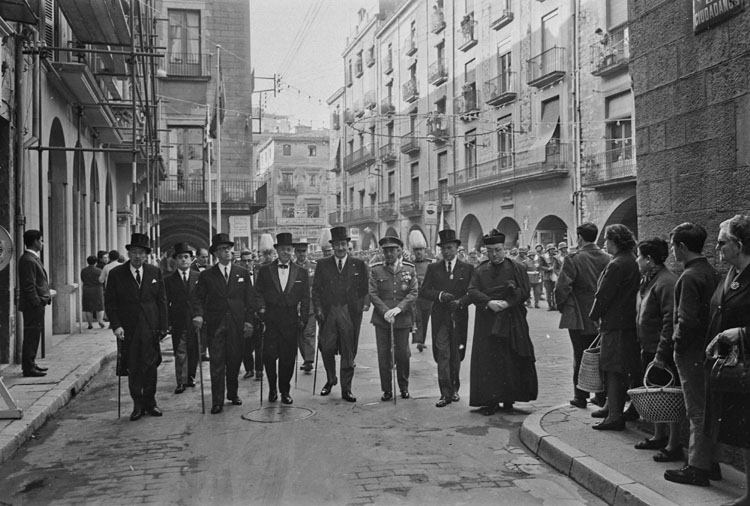 Fires de Sant Narcís. Les autoritats entrant al carrer Ciutadans des de la plaça del Vi. D'esquerra a dreta, el delegat provincial d'Hisenda, Joaquim Casanovas Ogués, el president de l'Audiència Provincial, José María Mesa Fernández, l'alcalde, Josep Bonet Cuffí, el governador civil, Ramón Muñoz González, el governador militar, Emerio Feliu Oliver, el president de la Diputació, Pere Ordis Llach i un sacerdot. 1968. Narcís Sans Prats. CRDI - Ajuntament de Girona - (Ampliar)