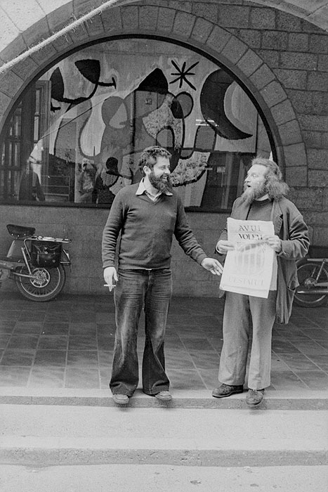 (Ampliar) - Retrat dels artistes Enric Ansesa i Damià Escudé, a l'exterior de la Fontana d'Or, al carrer Ciutadans, mostrant la portada del diari Avui reclamant l'Estatut. 1977. Joaquim Curbet Hereu. CRDI - Ajuntament de Girona.