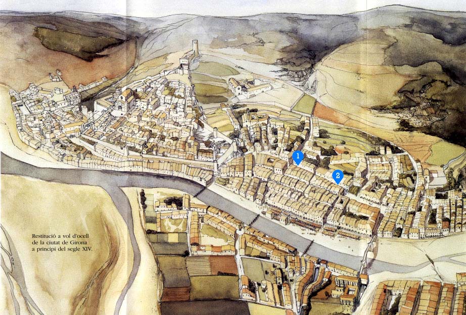 Restitució de la ciutat de Girona a principis del segle XIV. S'hi indica (1) Carrer de la Draperia, el tram nord de l'actual carrer dels Ciutadans, i (2) Ferreria Nova, el tram meridional del carrer. Dibuix de Jordi Sagrera (op. cit) - (Ampliar)
