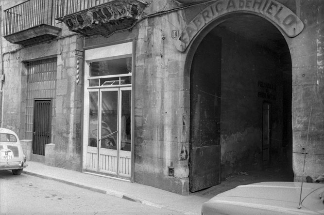 Porta d'accés a la perruqueria de l'hotel Centro, al carrer Ciutadans. A la dreta, el portal de la fàbrica de gel amb el llindar identificatiu. 1972. Narcís Sans Prats. CRDI - Ajuntament de Girona - (Ampliar)