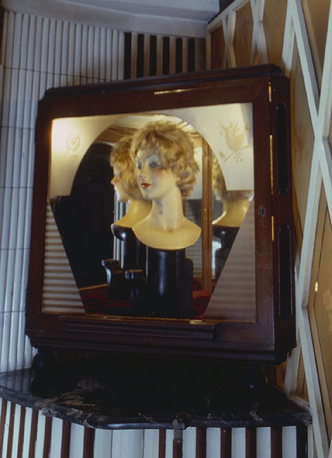 (Ampliar) - Detall de l'aparador d'una perruqueria del carrer Ciutadans. 1989. Carme Masià. CRDI - Ajuntament de Girona.