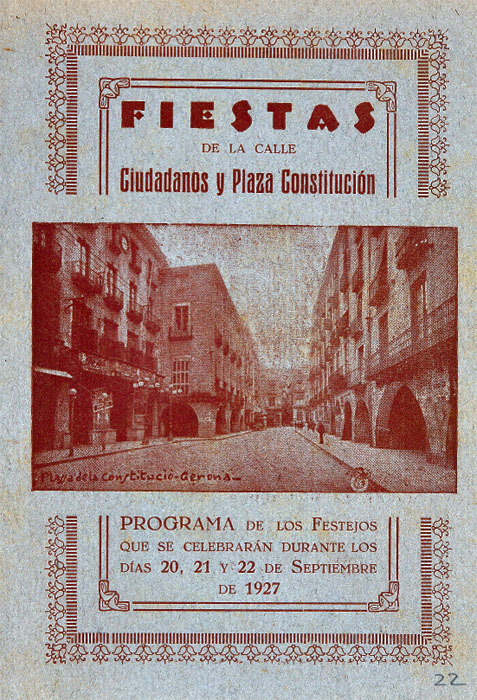 (Ampliar) - Programa de Festes del carrer Ciutadans i plaça Constitució, que es celebren durant els dies 20, 21 i 22 de setembre de 1927. Fons Ajuntament de Girona.