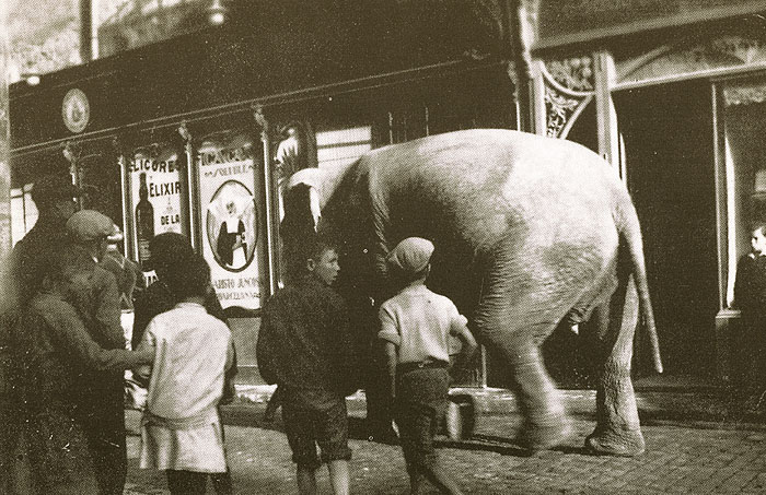 Elefant procedent del Circo Hipódromo Pinder circ circulant pel carrer dels Ciutadans de Girona. En segon terme, el colmado Gelabert. 1925. Marcel Prat Prat. CRDI - Ajuntament de Girona - (Ampliar)