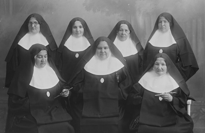 Retrat d'un grup de monges del convent de les Religioses de Sant Josep (Vetlladores) al pati del convent. 1931. Fotografia Unal. CRDI - Ajuntament de Girona - (Ampliar)