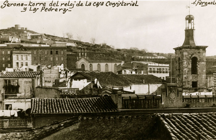 Vista del barri de les Pedreres des d'un punt elevat. En primer terme a la dreta, torre del rellotge de l'Ajuntament de Girona. En segon terme, el convent de les Vetlladores. 1931. Valentí Fargnoli i Annetta. CRDI - Ajuntament de Girona - (Ampliar)