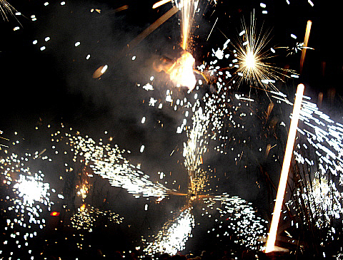 El correfoc es pot definir com una cercavila amb foc en el que una colla de diables ballen al ritme de la música tot seguint un recorregut establert, al final del qual, sovint, es representa un espectacle amb carros i bestioles. La colla dels Diables de l'Onyar, amb la participació d'altres colles de diables, van celebrar el 25 d'octubre de 2008 el correfoc més llarg dels darrers anys de Fires, amb motiu dels vint anys d'història de l'entitat. Van arribar amb una barcassa pel riu Onyar, passant per sota del pont de les Peixateries Velles i el pont de Pedra mentre alguns dels residents de les cases de colors, que havien apagat els llums de casa seva, simulaven l'incendi dels seus habitatges encenent bengales vermelles. ![]() El recorrregut, al llarg del qual es trobaven altres grups de diables que s'anaven incorporan al seguici, iniciat a la pujada del Pont de Pedra, seguia per la Plaça del Vi, Carrer d’Abeuradors, Carrer de les Ferreries Velles, Carrer de Cort Reial, Pujada de Sant Domènech, Travessia del Portal Nou, Carrer del Portal Nou, Plaça del General Marvà, Carrer de les Beates, Plaça de les Beates, Jardí de la Infància, Plaça de Catalunya, Passeig del General Mendoza, Plaça Salvador Espriu, per finalitzar, amb un espectacle final, a la Plaça del Lleó. Imatges del Correfoc de les Fires 2008, el dia 25 d'octubre. |