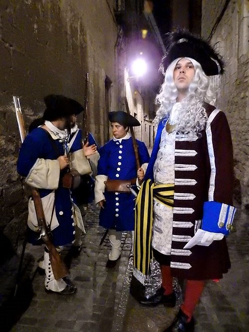![]() El dissabte 10 de setembre 2016, dins les activitats organitzades amb motiu de la Diada Nacional de Catalunya, va tenir lloc la X edició de la Marxa de Torxes de Girona, amb sortida a les escales de la Catedral, i que després del recorregut pels carrers del Barri Vell, va arribar a la plaça del Vi. Com a novetat, l'agrupació de recreació històrica Miquelets de Girona - Regiment de Sant Narcís, amb l'actriu Cristina Cervià, va escenificar la caiguda de Girona en mans borbòniques durant la Guerra de Successió. ![]() (Ampliar) - Tropes borbòniques franco espanyoles comandades pel Duc de Noailles, Mariscal de França.