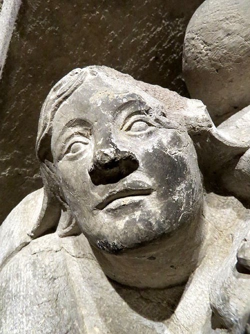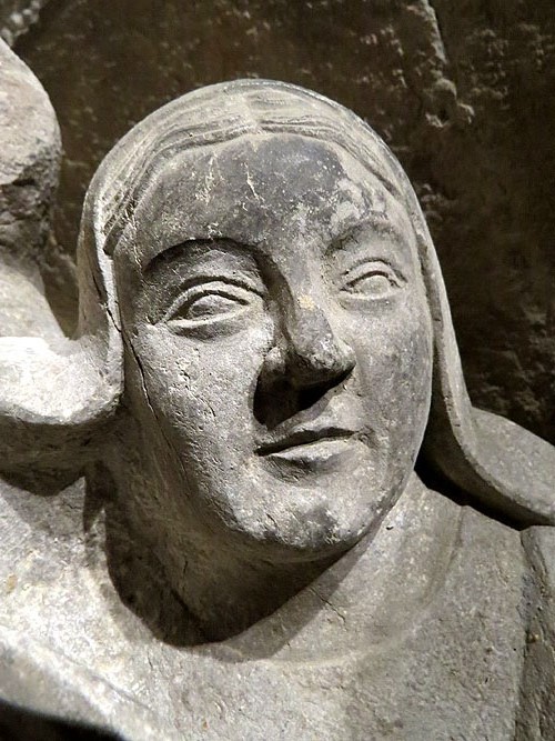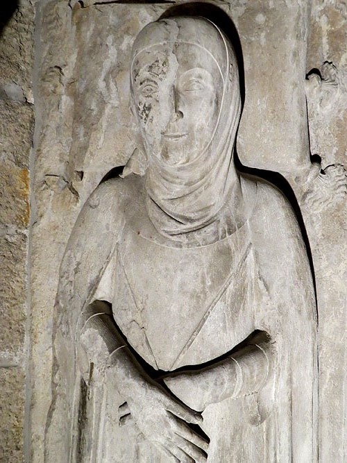 (3) - La descripció en en fa Jaume Marquès; (op. cit. a la bibliografi) é la següent: La cabeza está envuelta en una toca que sólo deja al descubierto el óvalo del bello rostro femenino, donde puede aprecíarse el curioso y realista detalle de un alfiler que sujeta dicha prenda; las manos aparecen cruzadas sobre el pecho y un cordón que emerge del cuello se anuda bajo las manos. Todo el cuerpo está cubierto de un largo manto que por la abertura delantera deja entrever la túnica talar de suaves pliegues, de cuyos bordes inferiores sobresalen los puntiagudos pies apoyados