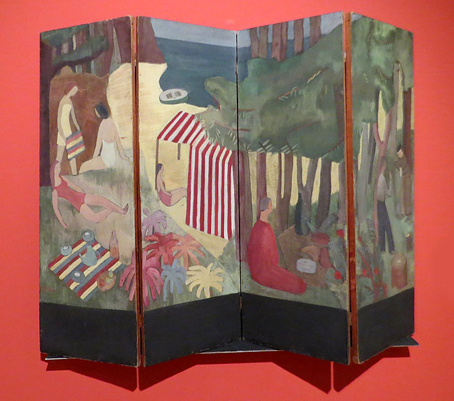 (Ampliar) - Estiueig. Esther Boix Pons. 1947. Projecte de paravent de quatre batents muntats sobre bastiment de fusta. Pintura a la cola sobre cartró. Col·lecció de la família Creus Boix.