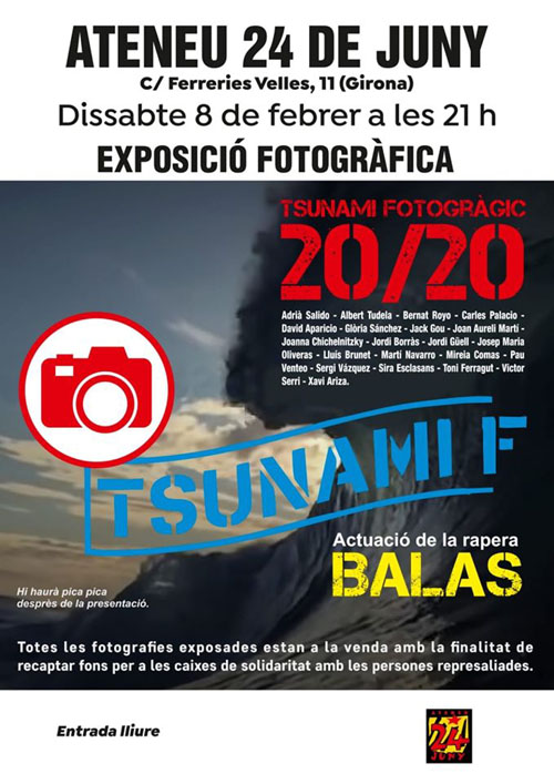 El dissabte 8 de febrer de 2020 es va inaugurar a l'Ateneu 24 de juny del carrer de les Ferreries Velles de Girona l'exposició "Tsunami fotogràfic 20/20" en la que vint professionals de la fotografia mostren la seva visió de quatre mobilitzacions ciutadanes multitudinàries convocades pel moviment civil anomenat Tsunami Democràtic els últims mesos de l’any 2019: el bloqueig a l’aeroport del Prat, el tall de 30 hores de l’AP-7 a la frontera amb l’Estat francès, el posterior tall de l’AP-7 a l’altura de Salt i Girona i l’acte al camp del Barça. Les fotografies s'han posat a la venda amb l’objectiu de recaptar fons per a les caixes de solidaritat amb les persones represaliades. A la inauguració hi va actuar la rapera Balas.