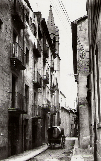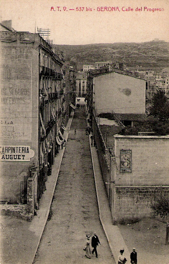 El carrer del Progres. Al fons, l'actual carrer de Santa Clara. Postal editada per Àngel Toldrà Viazo, Barcelona. Sense data. Col·lecció particular, Girona.