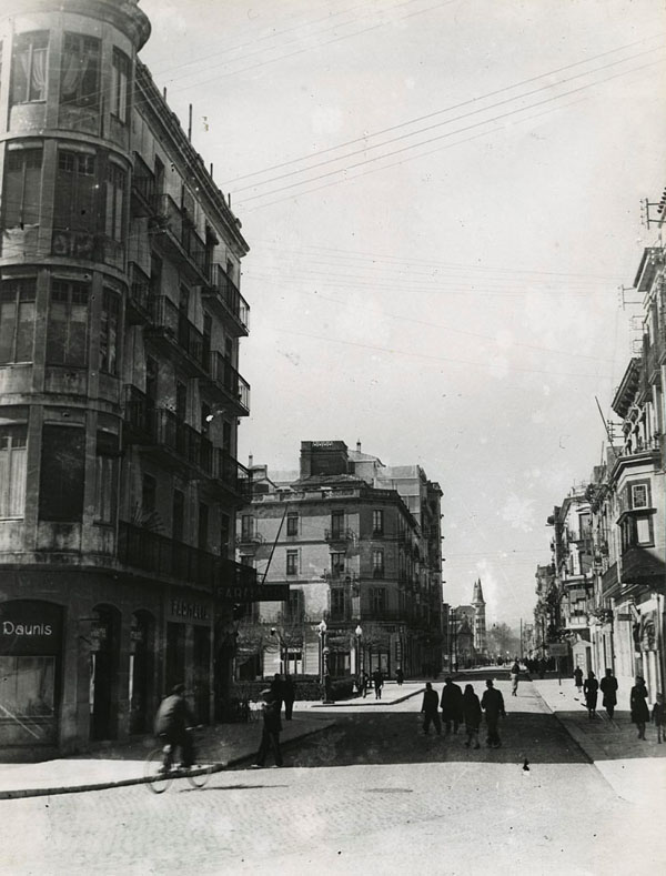 (Ampliar) - La plaça Marquès de Camps i carrer Santa Eugènia. Al fons apareix la Casa Teixidor, coneguda popularment com la Punxa. A primer pla i a l'esquerra, la farmàcia Caldelas. 1927-1940. Autor desconegut. Col·lecció Ajuntament de Girona.