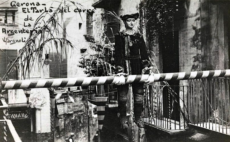(Ampliar) - El Tarlà de l'Argenteria, penjat al tram final del carrer. Al fons a l'esquerra, la façana de la farmàcia Masó abans de de la reforma. 1911-1935. Valent&uiacute; Fargnoli. Col·lecció Ajuntament de Girona.
