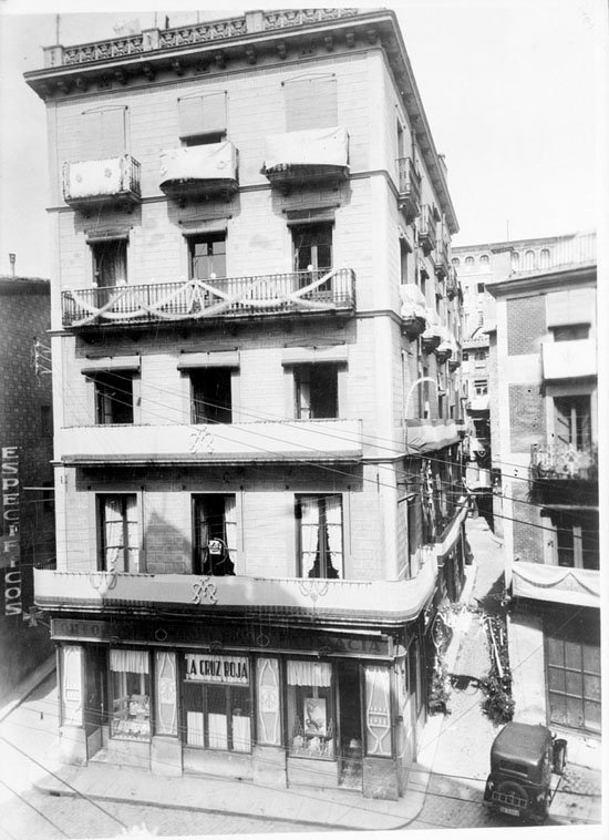 (Ampliar) - Façana d'un bloc de pisos, situat a la plaça de l'Oli. A la planta baixa hi ha la fàrmàcia Roca. 1935-1940. Foto Lux. Col·lecció Ajuntament de Girona.