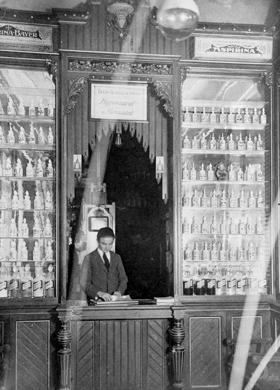 (Ampliar) - Establiment Ortopèdia-farmàcia Doctor Roca. Taulell de la la farmàcia amb el dependent al darrera i tot de lleixes amb productes farmacèutics. 1935-1940. Foto Lux. Col·lecció Ajuntament de Girona.