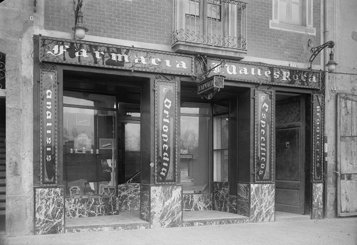 (Ampliar) - Façana de la farmàcia J.Vallés Roca, al carrer del Carme. 1932. Fotografia Unal. Col·lecció Ajuntament de Girona.