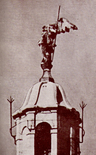 - Verás... ¡Son tantas las generaciones que he visto desde el día que fuí colocado en lo alto de este campanario! Aún me acuerdo perfectamente de aquel hombre, de aquel artista gerundense, menudo, insignificante casi, al que fué encargado labrar mi estatua. ¡Con qué amor se puso a trabajar! ¡Como procuraba dar a su obra la forma ideal que había concebido! Muchas veces, en noches serenas y estrelladas, contemplaba, apoyado en el alféizar de la ventana de su cuarto de trabajo, el firmamento, como si quisiera espiar los movimientos y las formas invisibles de los espíritus para, luego, idealizarlos en lo que debía constituir la obra por él soñada. No puedo quejarme de él... Desde entonces, ¡cómo han cambiado los tiempos!... He visto largos períodos de paz y abundancia. Otros de escasez, calamidades y de guerra... Yo mismo sufrí las consecuencias: mi cabeza me fué arrebatada cuando...