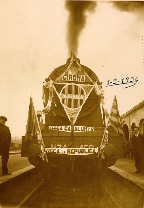 (Ampliar) - Tren engalanat a l'andana d'una estació, possiblement la de Girona. En els cartells es llegeix: "Girona. 16 febrer. Visca Catalunya. Visca la República". Salvador Crescenti, 1 de març 1936. CRDI - Ajuntament de Girona.