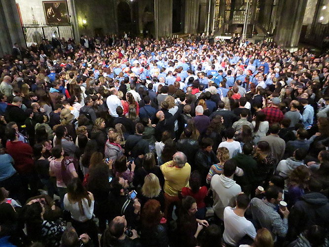 (Ampliar) - Apunts dels castells dins la nau de la Catedral, fets per Joan Escribà Serra. Imatge presa per gentilesa de l'autorA la finalització de la pujada del pilar, a les portes de la Catedral, varen donar la benvinguda als Marrecs l'alcaldessa de la ciutat, Marta Madrenas, i el bisbe de Girona, Francesc Pardo. Els pilar, al capdamunt de les escales, es va girar per saludar el nombrós públic que es va concentrar a la plaça i a l'escalinata de la Catedral per contemplar l'actuació dels castellers.