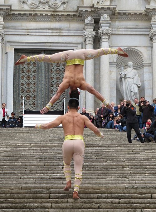 El dilluns 29 d'octubre 2018, diada de Sant Narcís, els peruans Duo Vitalys (Pablo Nonato i Joel Yaicate) van batre el rècord Guinness de pujar esglaons cap en cap, una modalitat en equilibri en què el portor sosté amb el cap el seu company en posició invertida mentre puja escales. Van pujar 99 esglaons en 53 segons, superant la marca de fa dos anys d'una parella vietnamita, els Giang Brothers, que va pujar els 90 de l'escala de la Catedral. ![]() (Ampliar) - Moment de l'arribada a l'últim graó. L'organització del repte anava a càrrec del Circ Charlie Rivel, que tenia en aquest acte, en una prèvia a les diferents actuacions previstes a la Cúpula de les Arts. Per poder certificar el rècord, seguint la normativa, calia disposar de cronometradors oficials, que van anar a càrrec del GEiEG, un enginyer que mesurava la distància i gravacions en directe ininterrompudes des de diferents angles, entre d'altres. Tot es va enviar als responsables del Guinness. ![]() (Ampliar) - Joan Mompart amb el Duo Vitalys, dalt les escales de la Catedral. ![]() (Ampliar) - Preparació de la pujada les escales de la Catedral. |