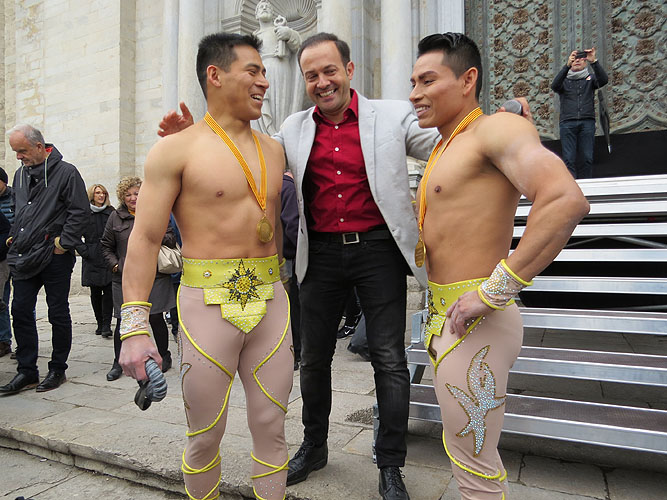 ![]() (Ampliar) - Pablo Nonato i Joel Yaicate, el duo Vitalys, al capdamunt de les escales de la Catedral. ![]()
