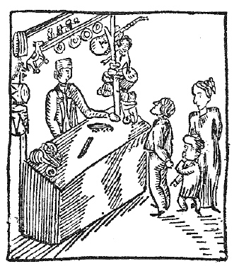 Firataire a la seva parada de joguines, a Girona, en un gravat antic.