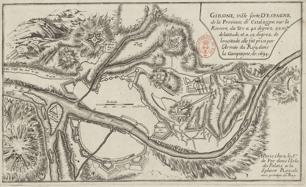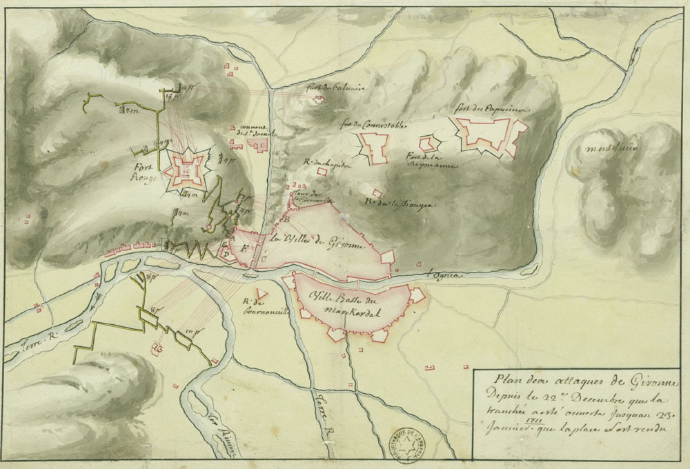 (Veure'l sencer) - Plan des attaques de Gironne depuis le 22e Décembre, quer la tranchée a eté ouverte jusqu'au 23 Janvier 1711 que la place est rendu. Detall que mostra els Forts del Calvari, Conestable, Reina Anna i Caputxins. Bibliothèque Nationale de France