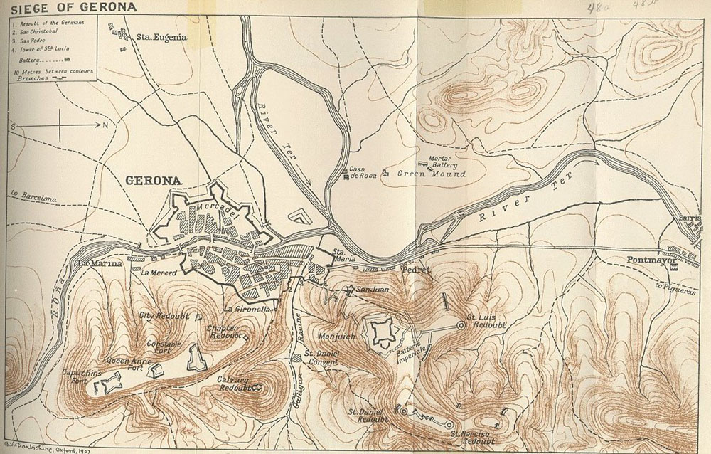 (Veure'l sencer) - Gerona - French Siege: May - September 1809. Detall que mostra els Forts del Calvari, Conestable, Reina Anna i Caputxins, i el castell de Montjuïc. Bibliothèque Nationale de France