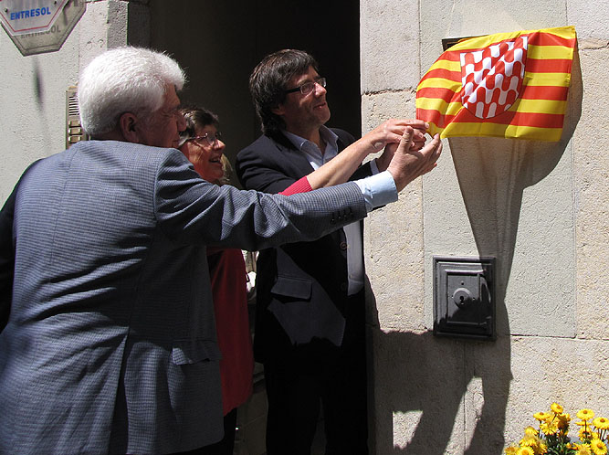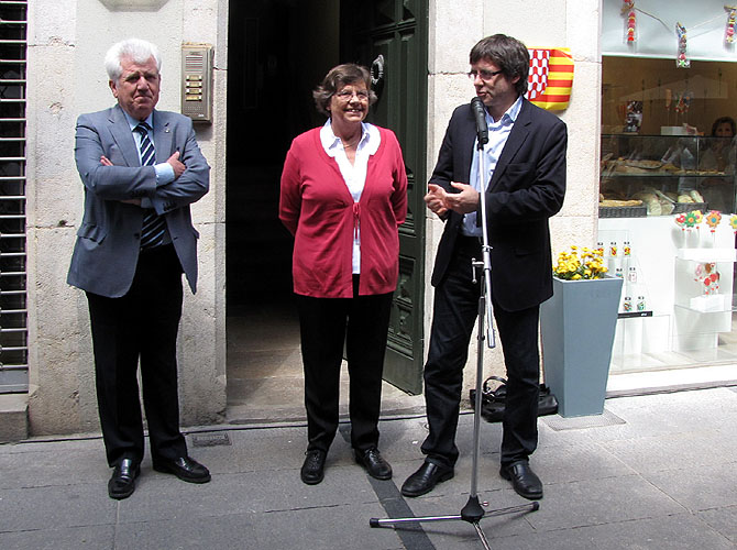(Ampliar) - L'alcalde de Girona, Carles Puigdemont, la filla de l'homenatjat Teresa Masià i l'alcalde de Maçanet de Cabrenys, Lluís Carbó.
