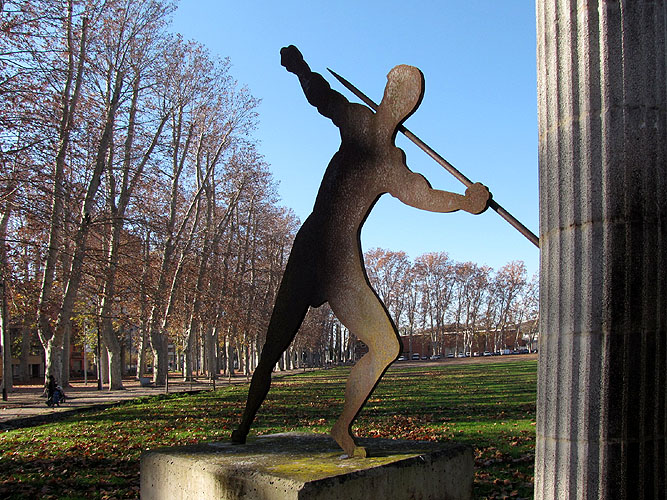 També coneguda per "En record a l’antic estadi del GEiEG 1944-1995", aquesta figura d'acer i formigó es troba al parc de la Devesa, on hi havia fins el 1995 les pistes d'atletisme del Grup Excursionista i Esportiu Gironí (GEiEG). És un treball d'autor desconegut, inspirada en una obra d’Antoni Varés, i en una placa s'hi llegeix: "Els vells atletes del Grup en record de l'antic estadi del G.E.i E.G. a la Devesa 1944-1995". Va ser promoguda pel GEiEG amb el suport de la Caixa de Girona.