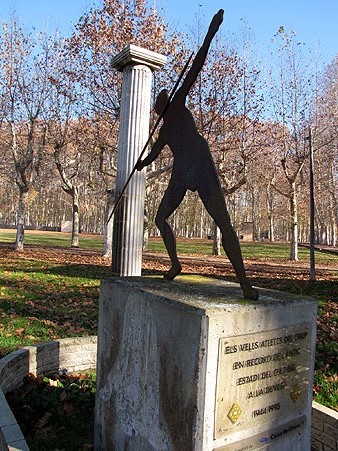 conjunt d'arbres que volen ser el conjunt del Mediterrani i una columna hel·lena, lloc on va iniciar-se aquest esport. La inscripció que es pot llegir diu "Els vells atletes del Grup en record de l'Estadi del GEiEG de la Devesa,