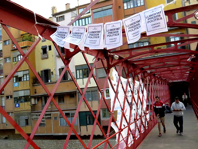 (Ampliar) - El pont de les Peixateries Velles, l'endemà de la manifestació, amb pancartes i cartells. L'acte va comptar amb parlaments de les dues entitats i Laura Iglesias, del sindicat USTEC, qui va llegir un manifest en defensa de l'escola catalana. Sarai Espinosa, membre del Comitè de Defensa del Referèndum, va demanar entre aplaudiments al govern català que s'apliqués els resultats de l'1 d'octubre. L'exjugadora de bàsquet de l'UniGirona Noemí Jordana va llegir un manifest unitari en què es va exigir l'alliberament immediat dels empresonats.