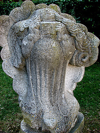 L'escultura de pedra nummulítica de Girona, obre Josep Bosch Puy, conegut com Piculives, mostra el considerable volum de la Majordoma, amb una gran panxa, ales, i una aureola arrodonida que l'envolta, que sosté el "Llibre dels misteris de Girona" entre les mans, atès que segons la llegenda, va predir la mort de Sant Narcís i de Sant Feliu. Curiosament, la rotunditat d'aquesta figura contrasta amb el vestit lleuger i vaporós que porta.at utilitzades en el dibuix dels rínxols dels cabells, de les ales i de l'aureola que l'envolta.