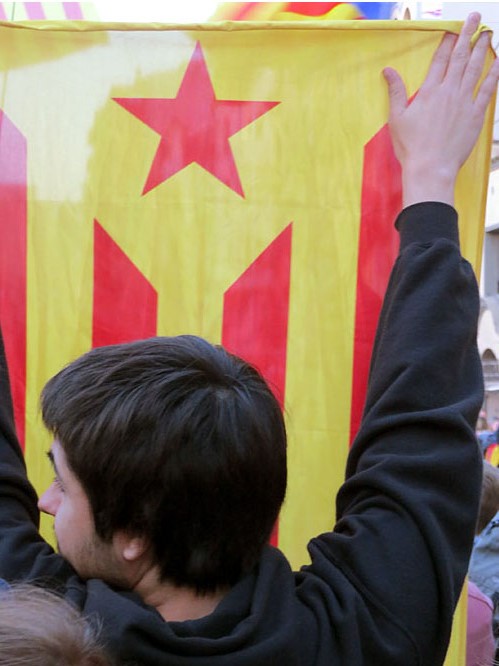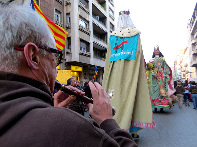 (Ampliar) - La manifestació al carrer de Barcelona. Els manifestants van continuar per la travessia fins arribar a la rotonda de l'Assemblea de Catalunya, al costat del Palau de Justícia. Allà hi havia muntat l'escenari des d'on Montse Bassa, germana de l'exconsellera Dolors Bassa, va llegir un manifest conjunt. L'acte va finalitzar amb el cant de "L'Estaca", de Lluís Llach, entre llanternes de mòbils enceses, i "Els Segadors", acompanyats de la música de diversos instruments tocats per, entre d'altres, membres de "Els berros de la cort".